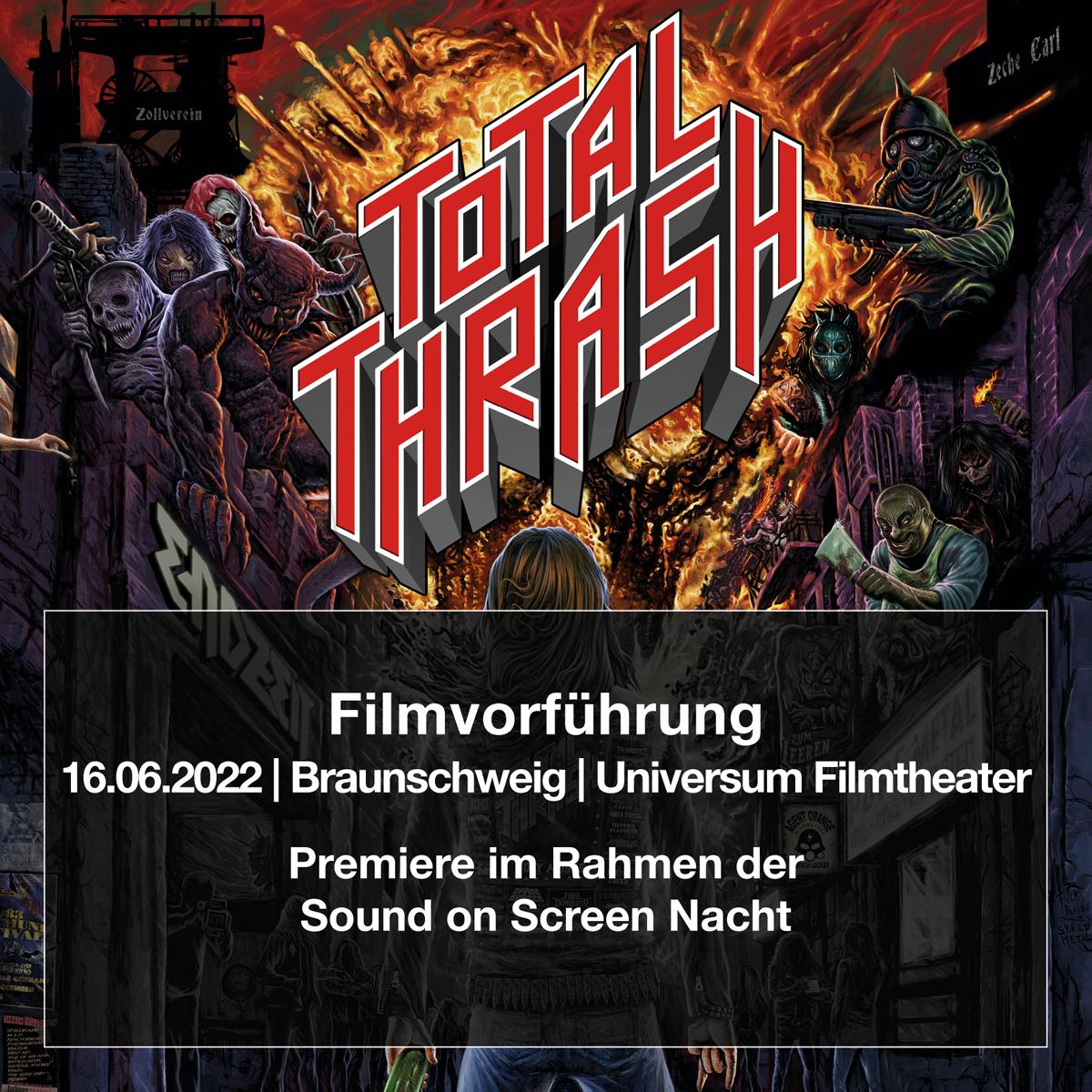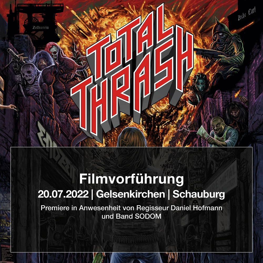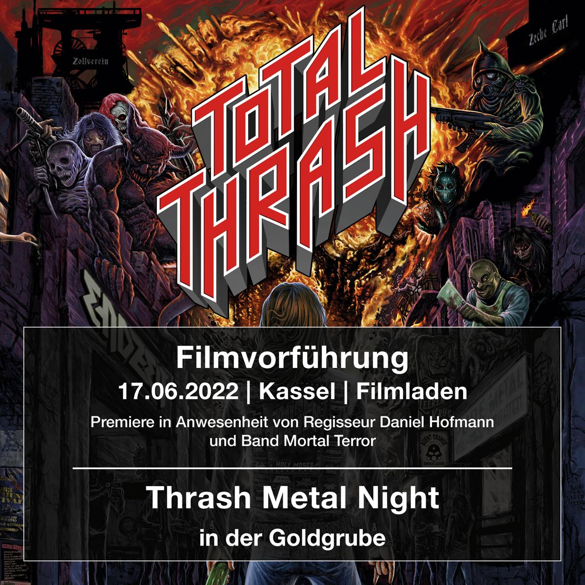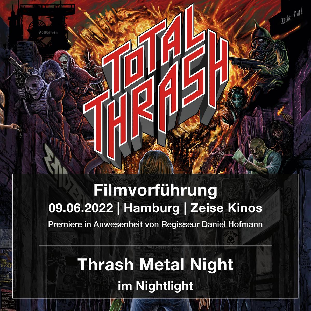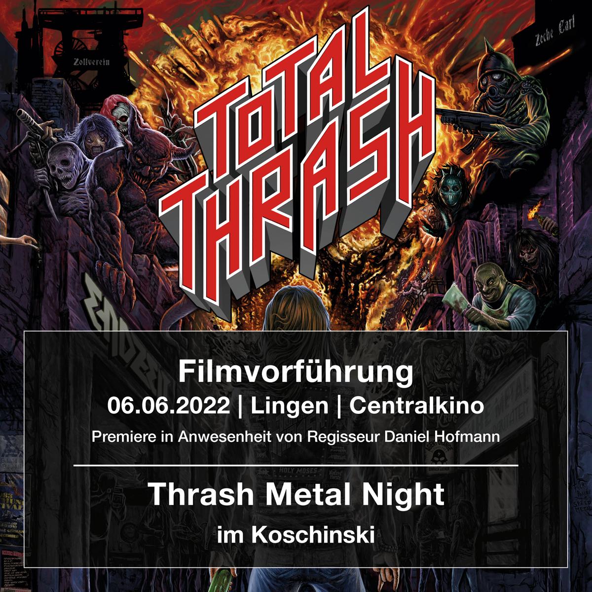 Weltpremiere in Anwesenheit von Regisseur Daniel Hofmann, dem Total Thrash Filmteam und vielen Protagonisten aus dem Films selbst. Anschliessend Autogrammstunde, Fotoecke sowie Meet and Greet mit den Stars des Filmes vor Ort. Im Anschluss After Show Party im Cafe Nord.