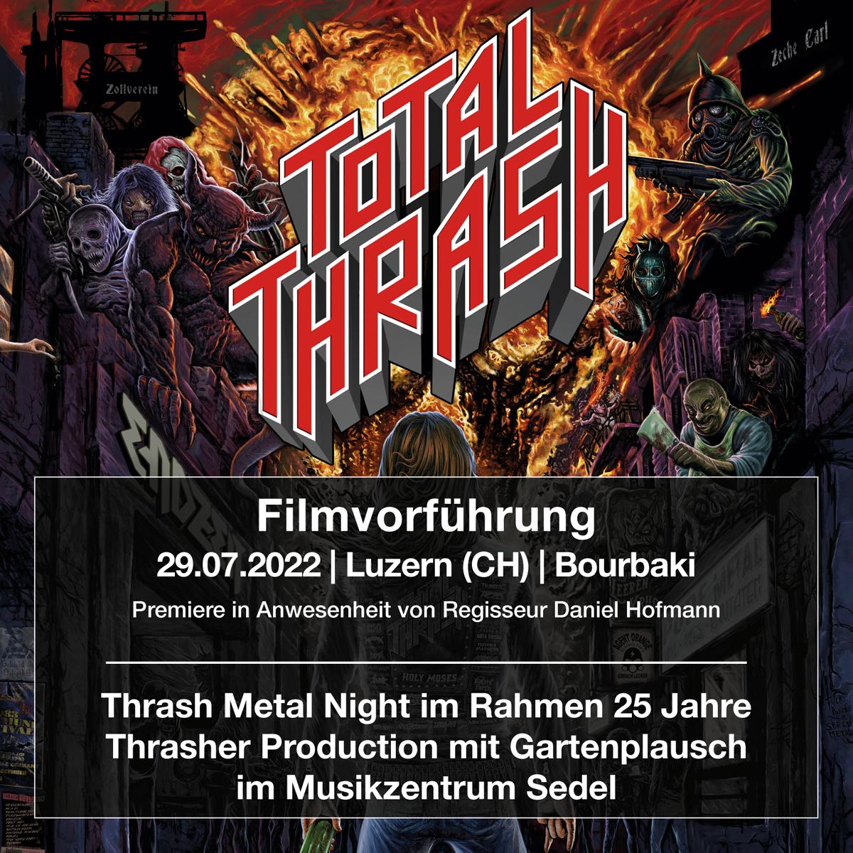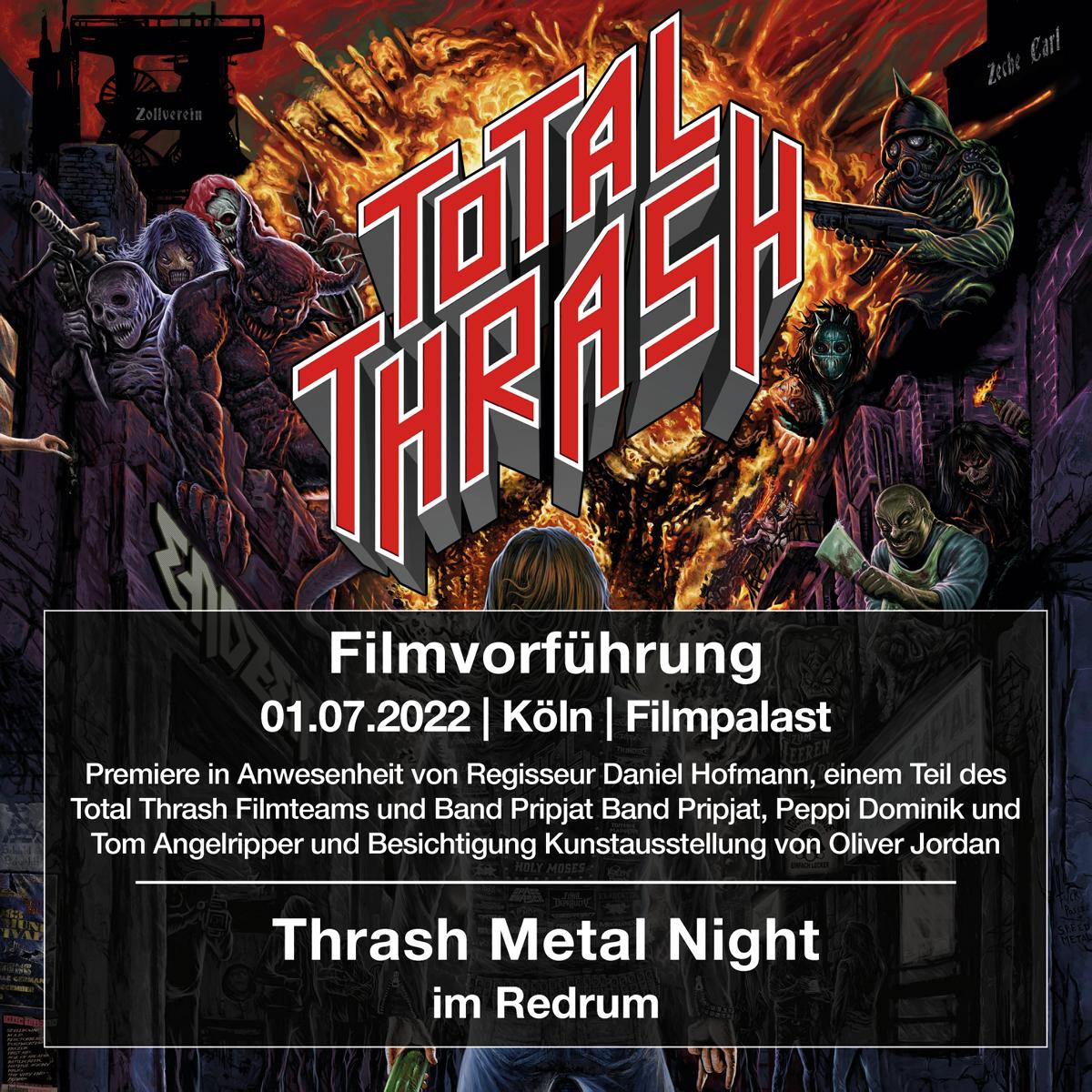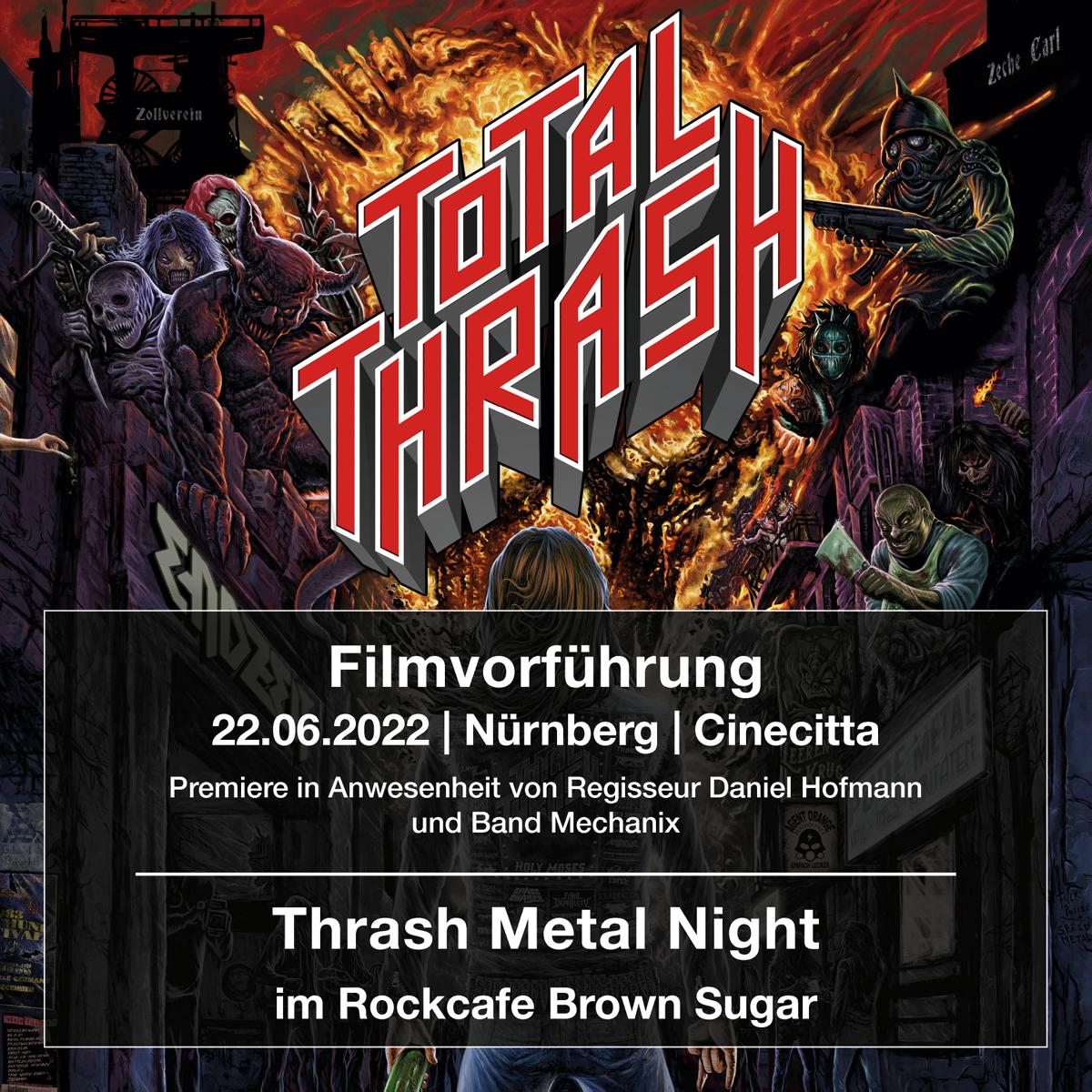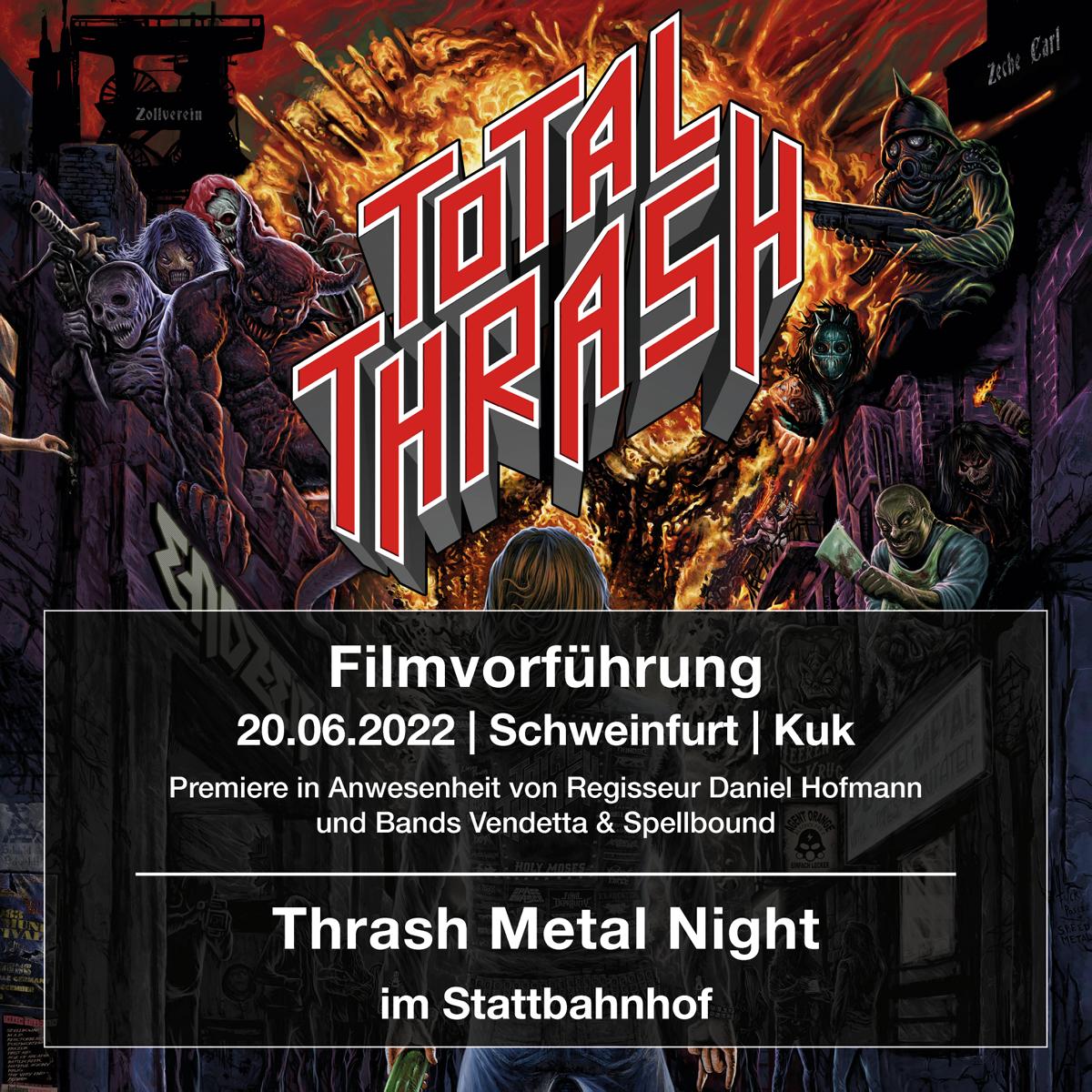 Weltpremiere in Anwesenheit von Regisseur Daniel Hofmann, dem Total Thrash Filmteam und vielen Protagonisten aus dem Films selbst. Anschliessend Autogrammstunde, Fotoecke sowie Meet and Greet mit den Stars des Filmes vor Ort. Im Anschluss After Show Party im Cafe Nord.