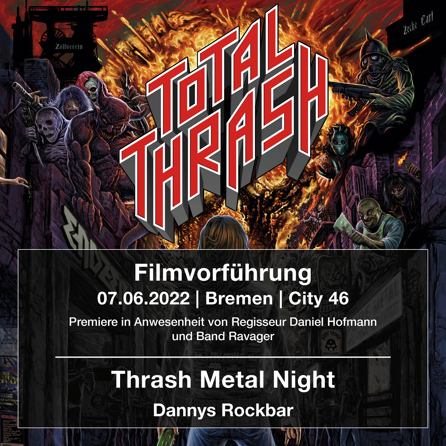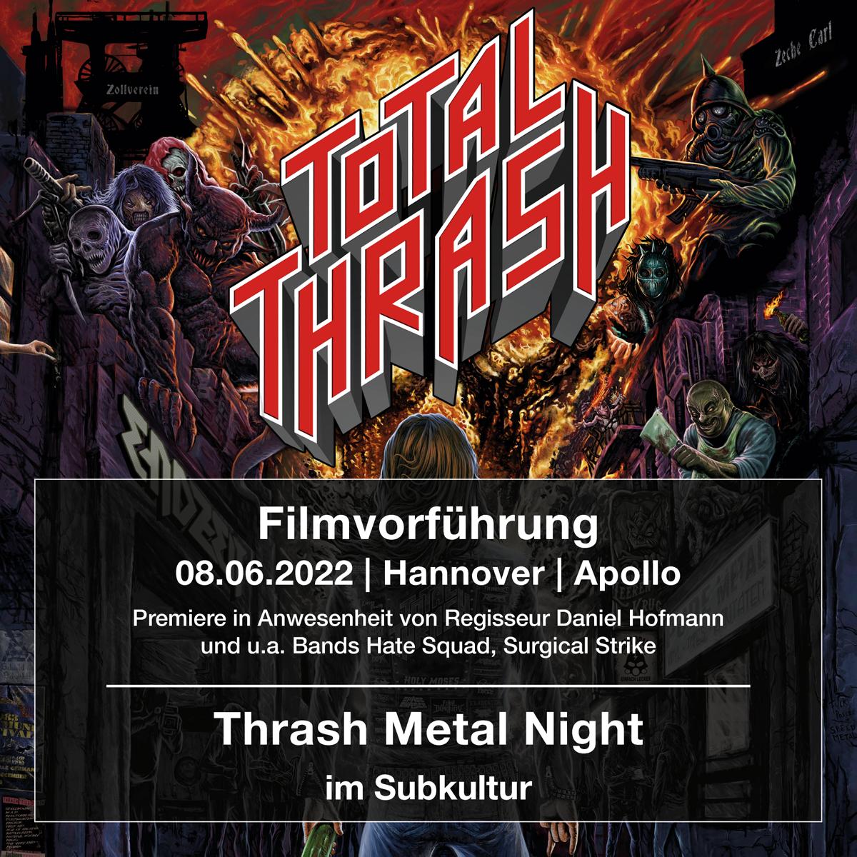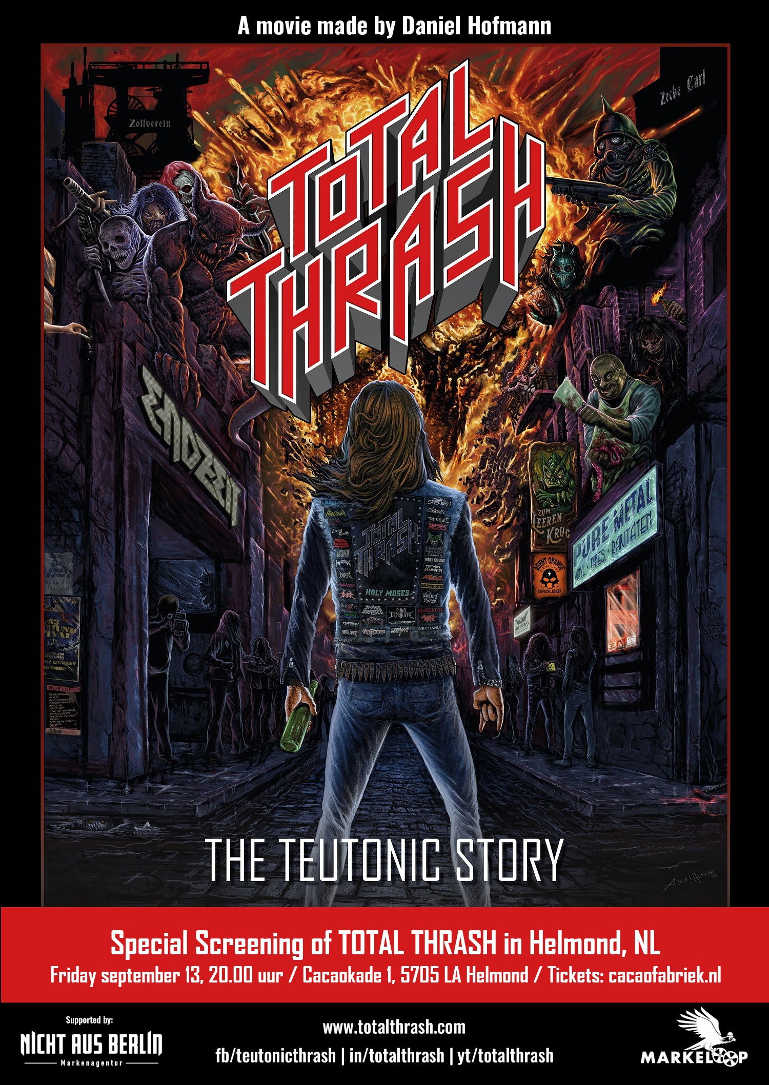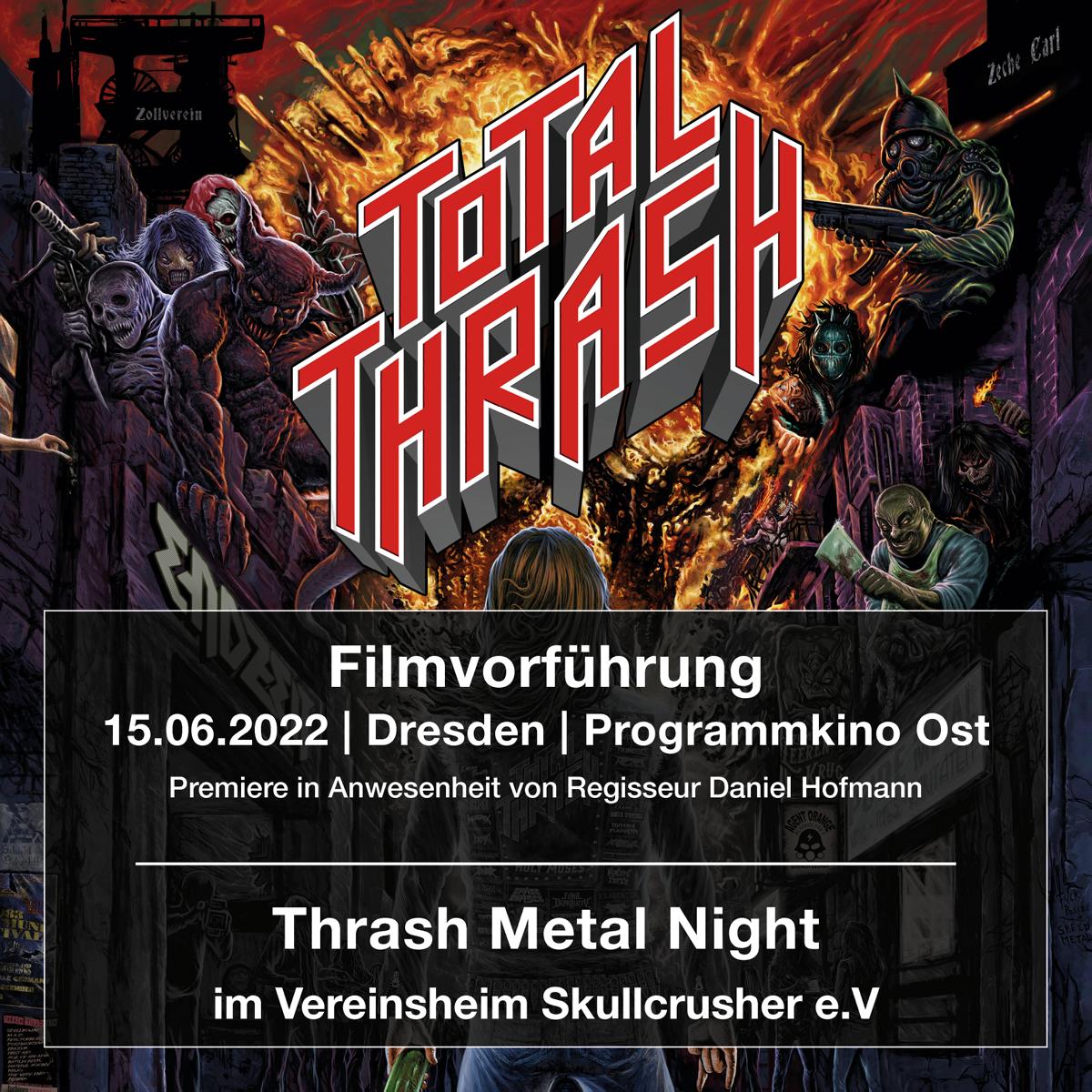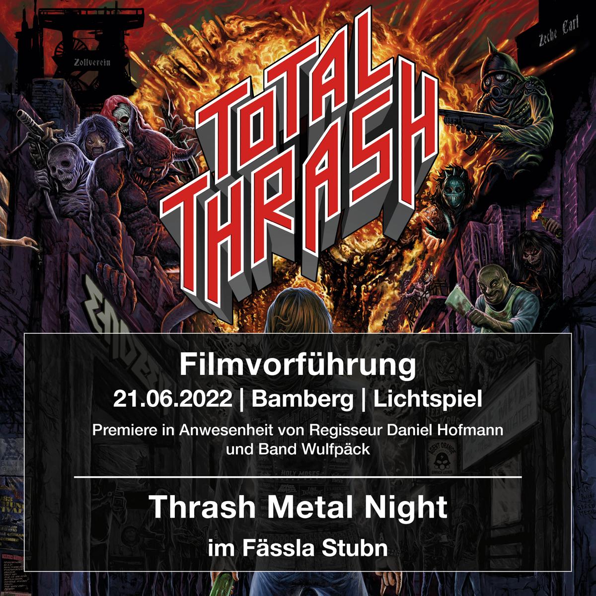 Weltpremiere in Anwesenheit von Regisseur Daniel Hofmann, dem Total Thrash Filmteam und vielen Protagonisten aus dem Films selbst. Anschliessend Autogrammstunde, Fotoecke sowie Meet and Greet mit den Stars des Filmes vor Ort. Im Anschluss After Show Party im Cafe Nord.